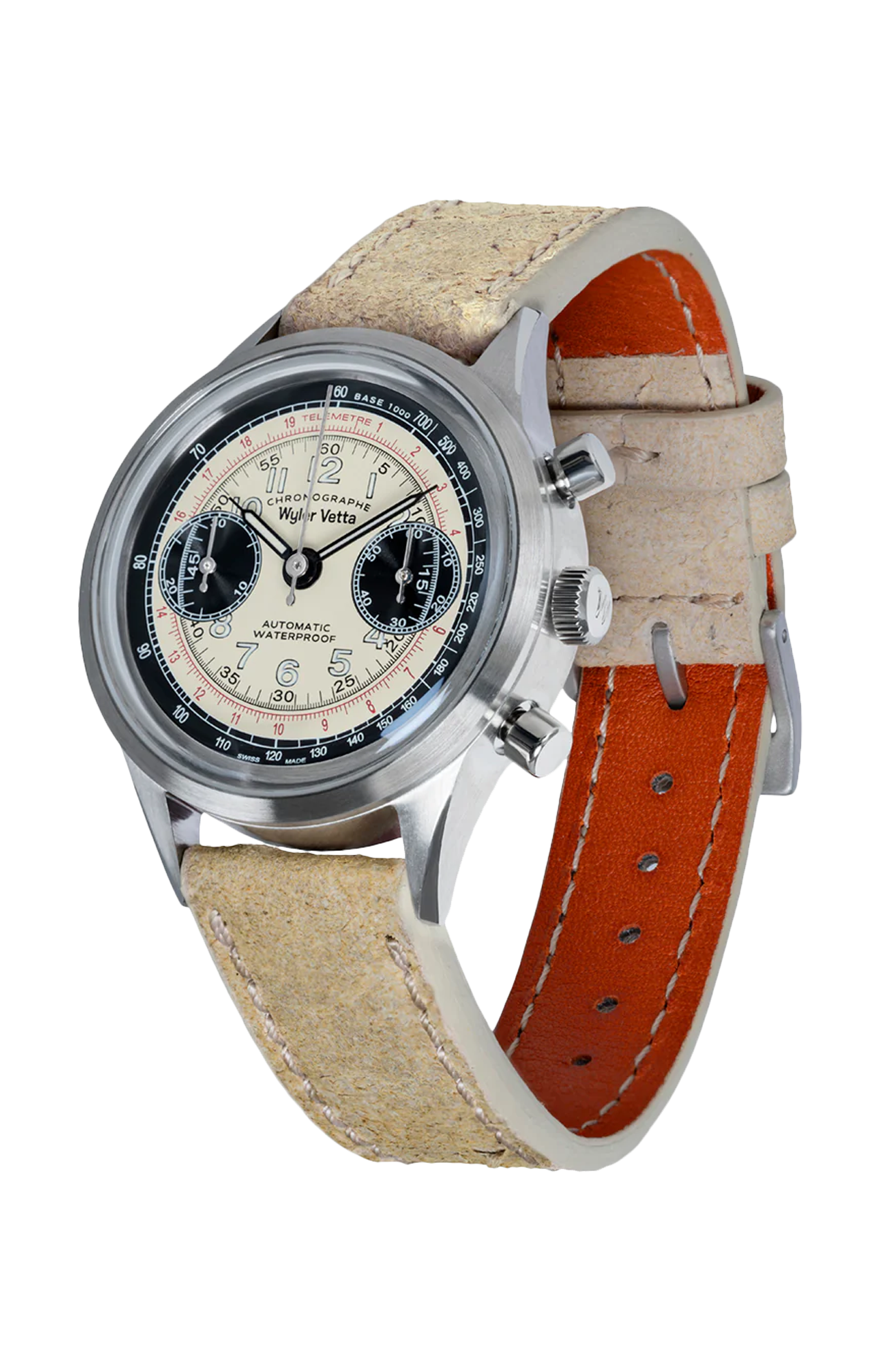 Orologio CHRONO 36, cassa in acciaio satinato 36 mm, quadrante panda panna/nero, cinturino in pelle mohawk colore champagne.
