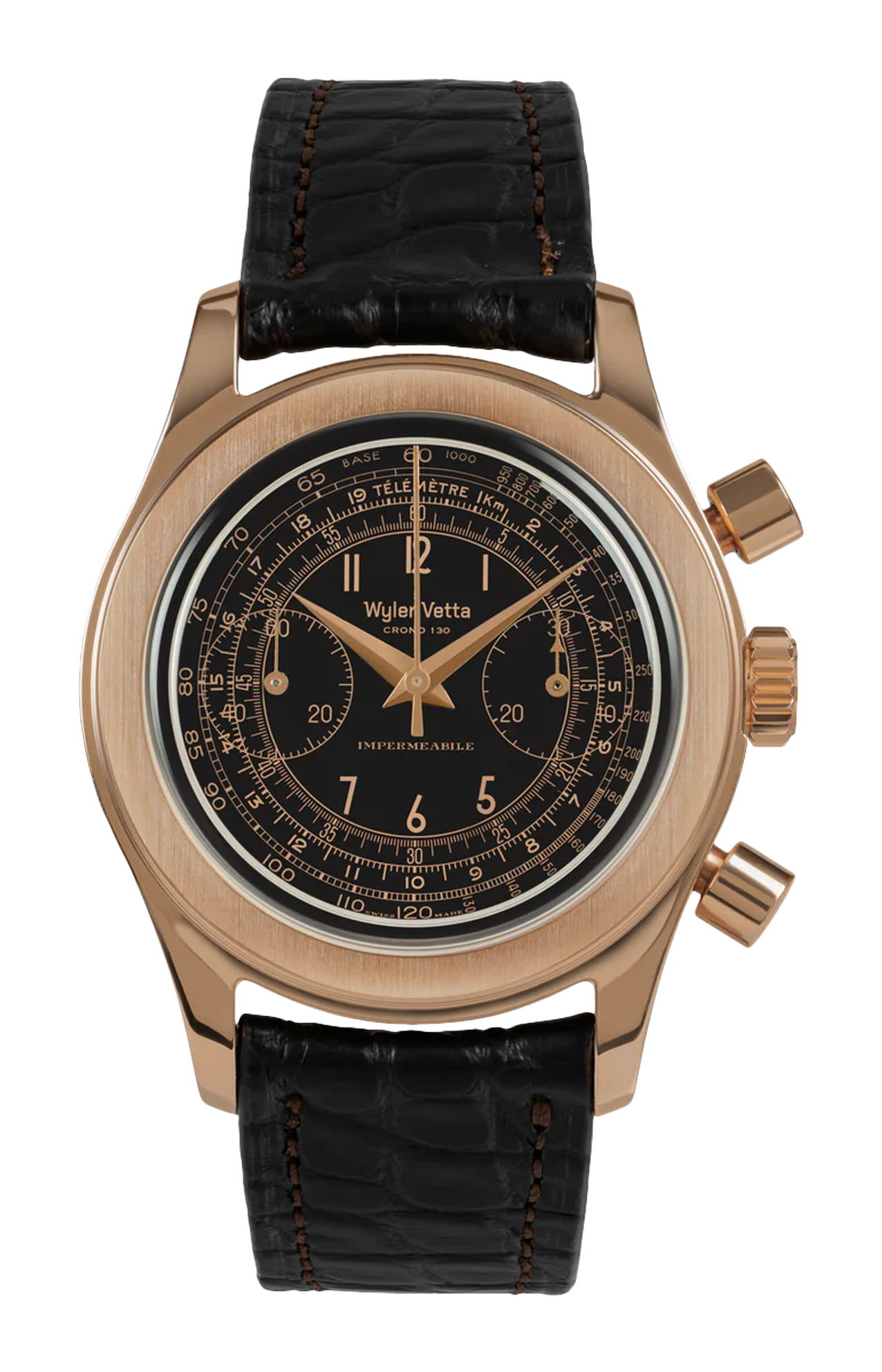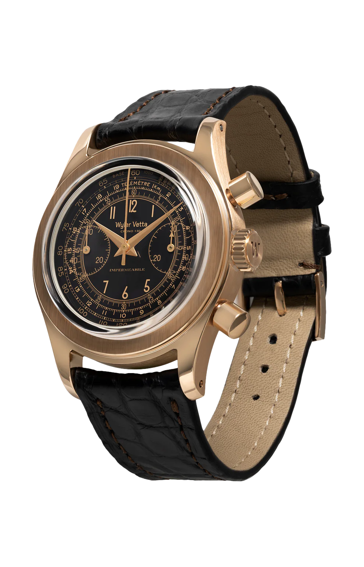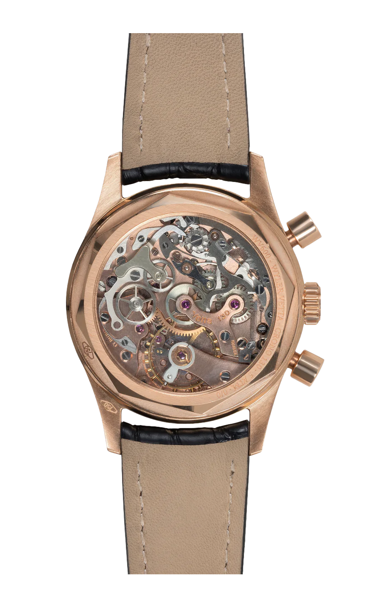La cassa in oro rosa 18 carati accoglie un quadrante realizzato con autentica finitura GILT, secondo la tradizione degli anni quaranta/cinquanta: attraverso un bagno galvanico, il nero emerge profondo e intenso, esaltando indici e grafica con un contrasto di grande fascino. Ogni elemento - dalla cassa alle lancette, fino a pulsanti e corona - è in oro 18kt.