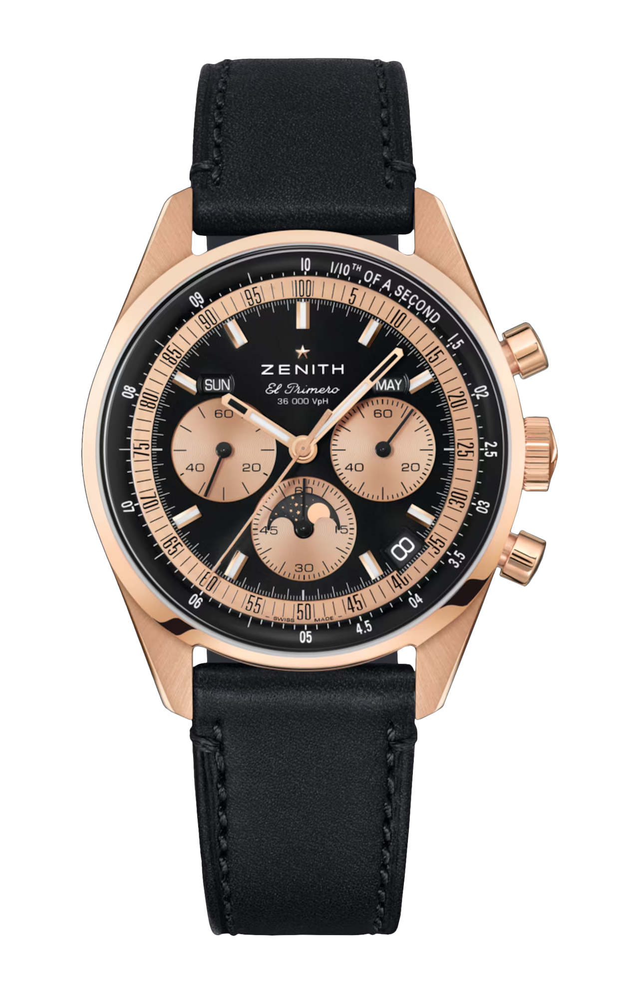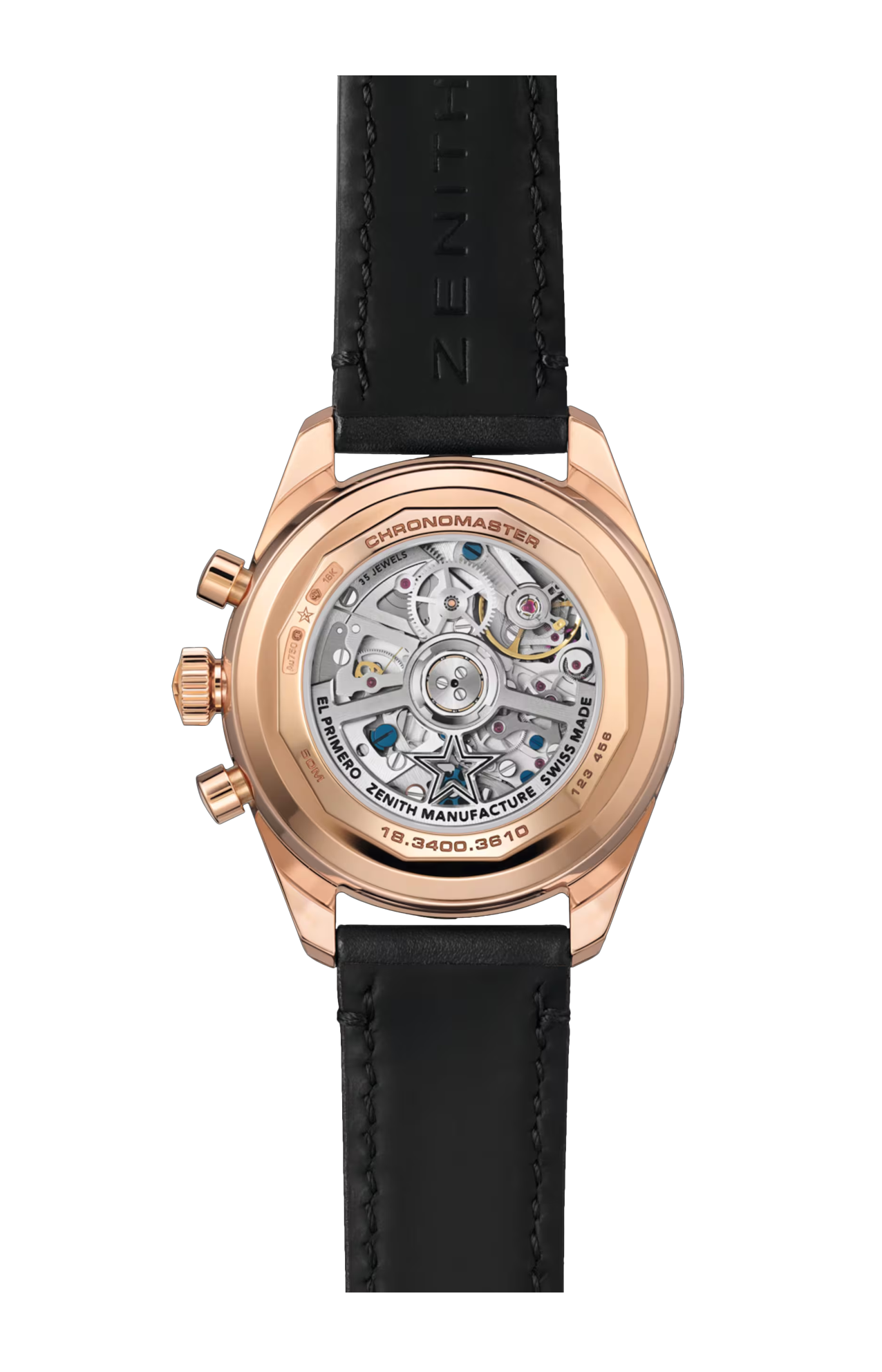 Il Chronomaster Original Triple Calendar è animato dal calibro automatico El Primero 3610. Questa moderna variante del leggendario cronografo Zenith consente una straordinaria precisione di lettura al 1/10 di secondo. I suoi scatti scandiscono con precisione 1/10 di secondo in corrispondenza delle graduazioni sulla minuteria: per sfruttare appieno la sua frequenza di 5 Hz, la lancetta dei secondi cronografici compie una rivoluzione del quadrante in 10 secondi, invece dei tradizionali 60 secondi. Nonostante l'aggiunta del meccanismo del calendario completo, la riserva di carica è di 60 ore. La struttura integrata del movimento si può ammirare attraverso il fondello in vetro zaffiro, che rivela una ruota a colonne blu e un rotore aperto con la stella a cinque punte di Zenith. Il Chronomaster Original Triple Calendar in oro rosa è corredato da un cinturino in pelle di vitello nera con fibbia déployante in oro rosa 18 carati.
