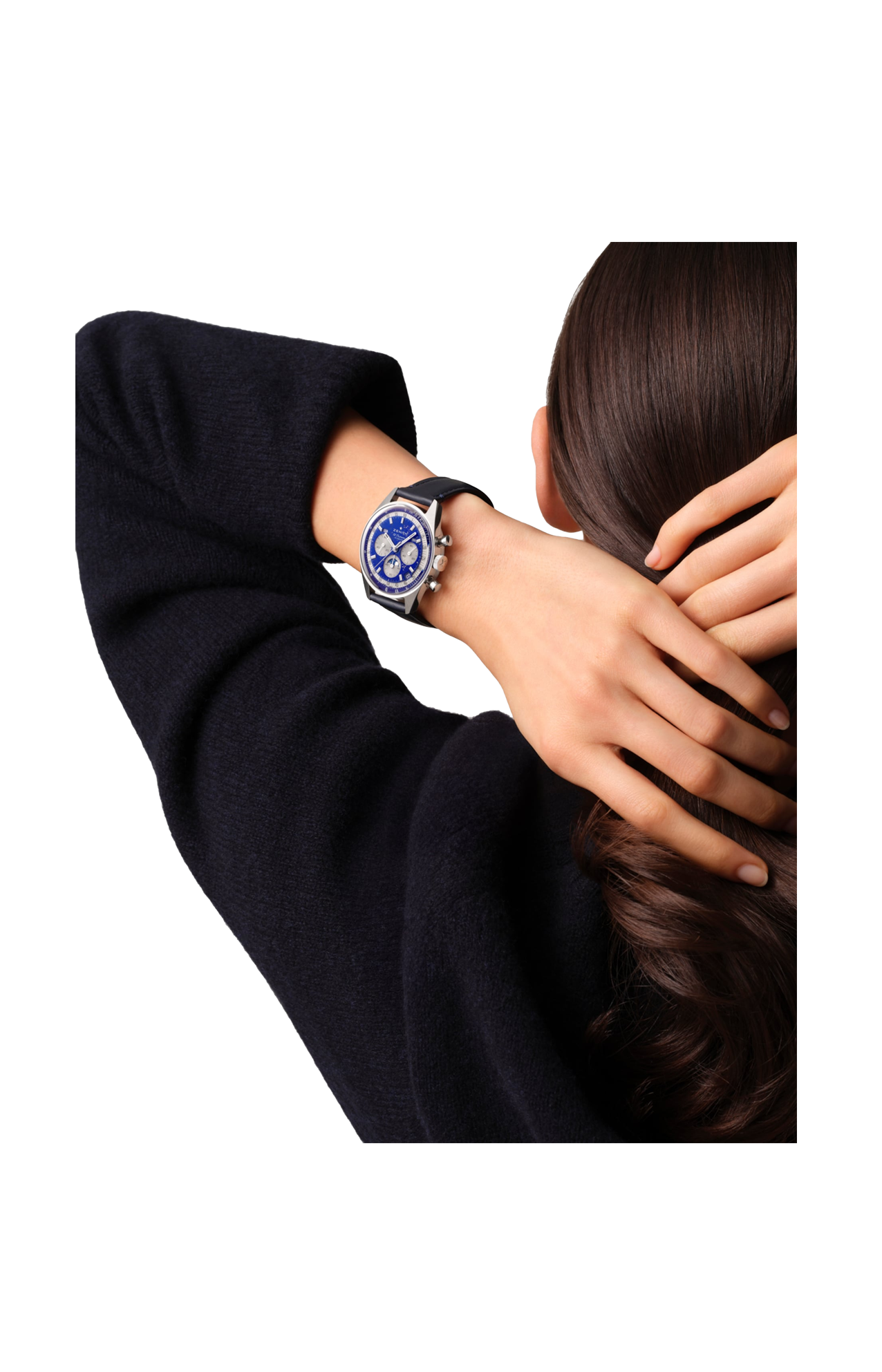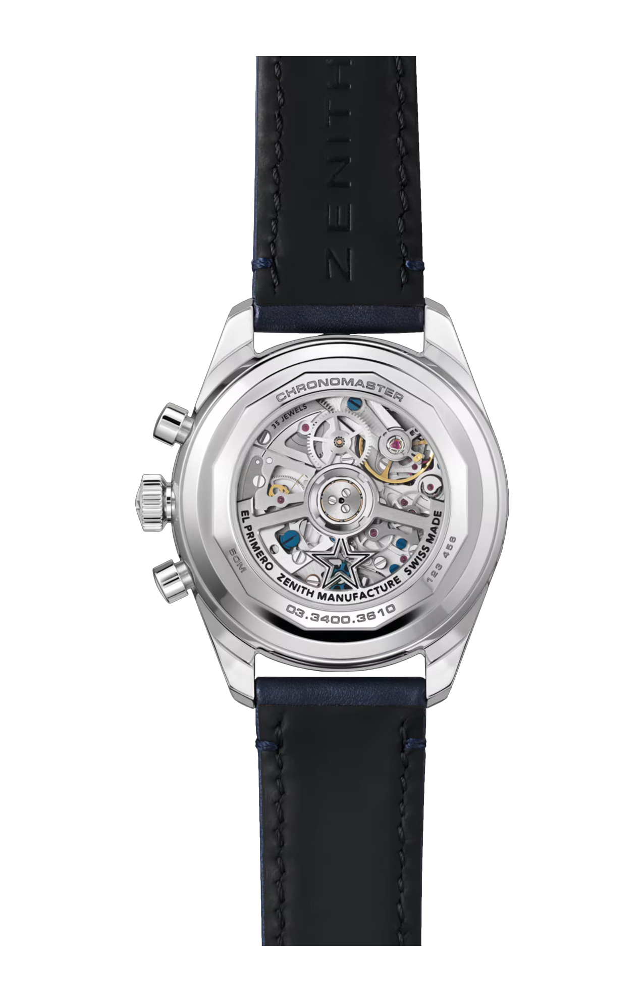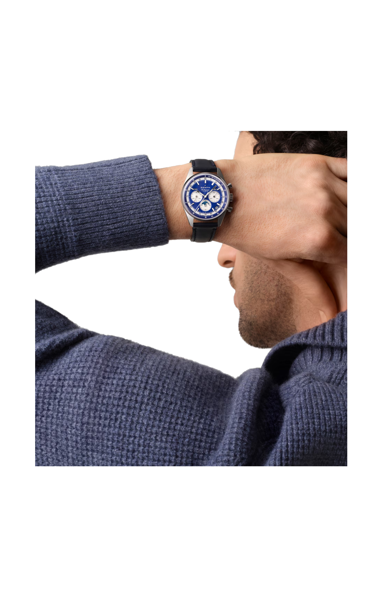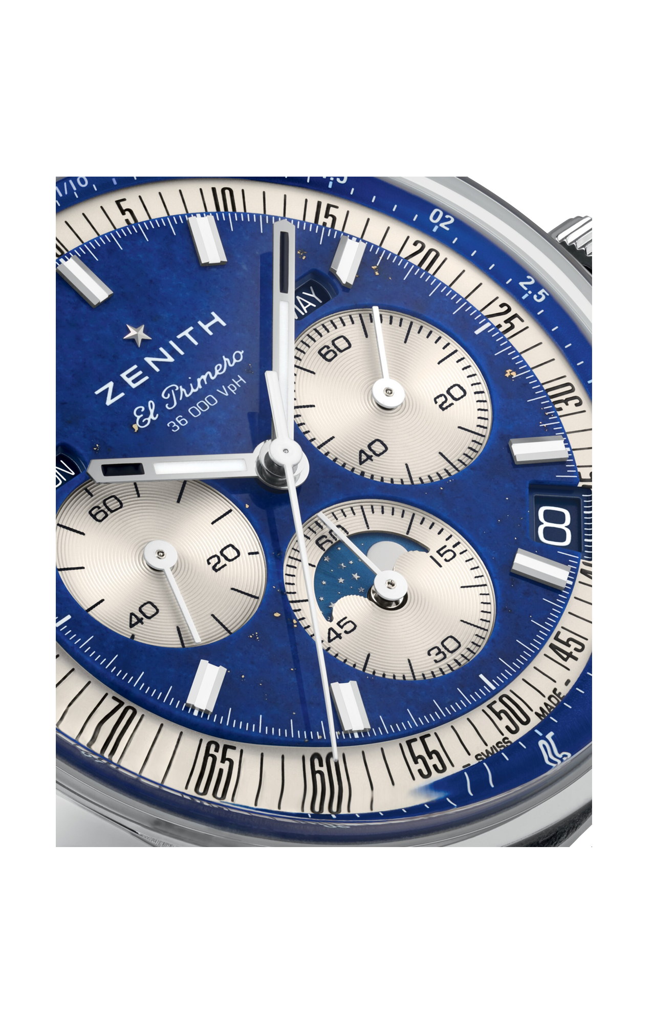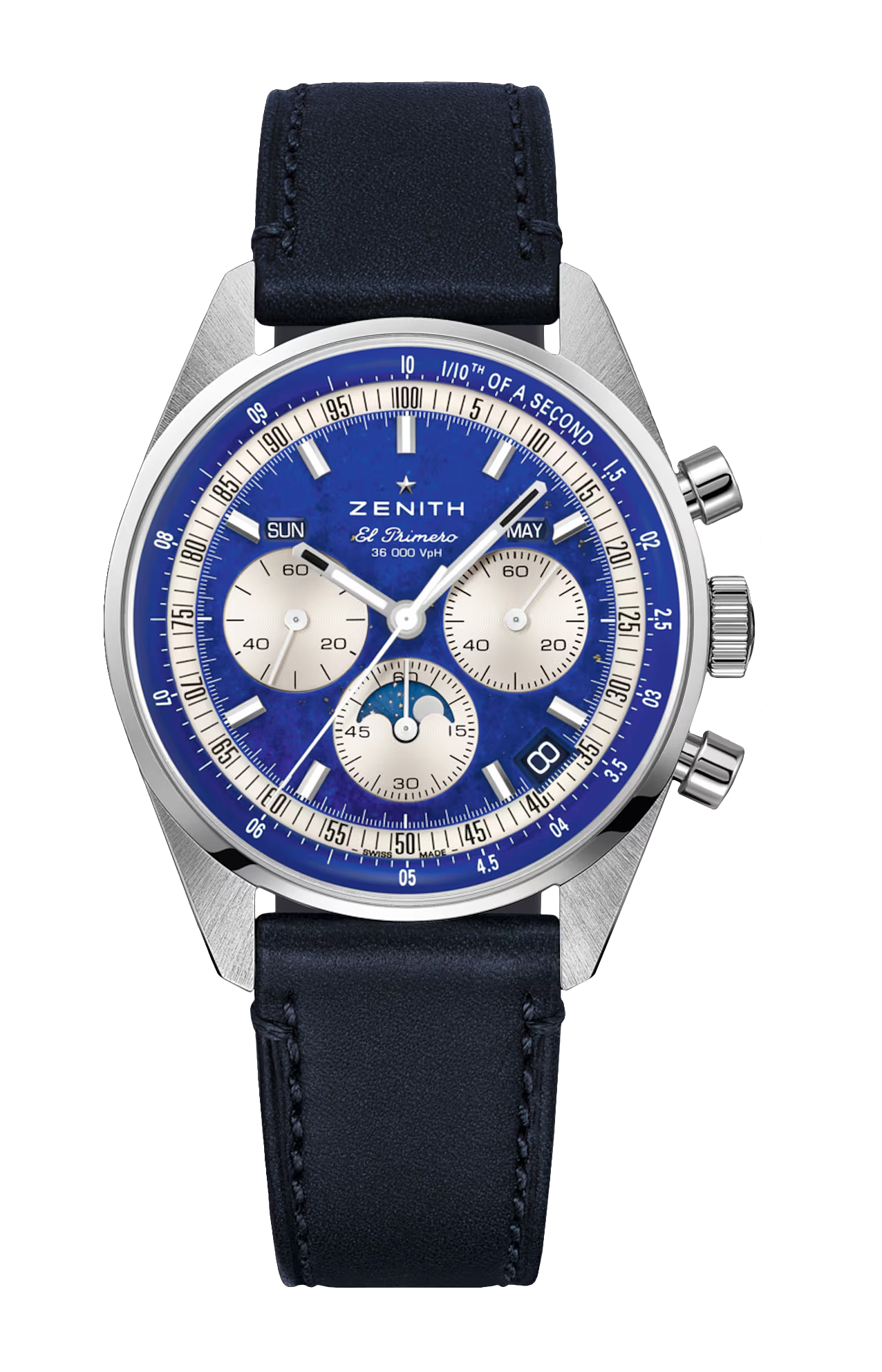 Il Chronomaster Original Triple Calendar presenta una cassa in acciaio da 38 mm ed è dotato di un cinturino in pelle di vitello blu e di un bracciale in acciaio. L'elegante quadrante in lapislazzuli presenta contatori argentati. Animato dal movimento automatico ad alta frequenza El Primero 3610 dotato di cronografo con precisione di lettura al 1/10 di secondo e indicazioni di giorno, data, mese e fasi lunari.