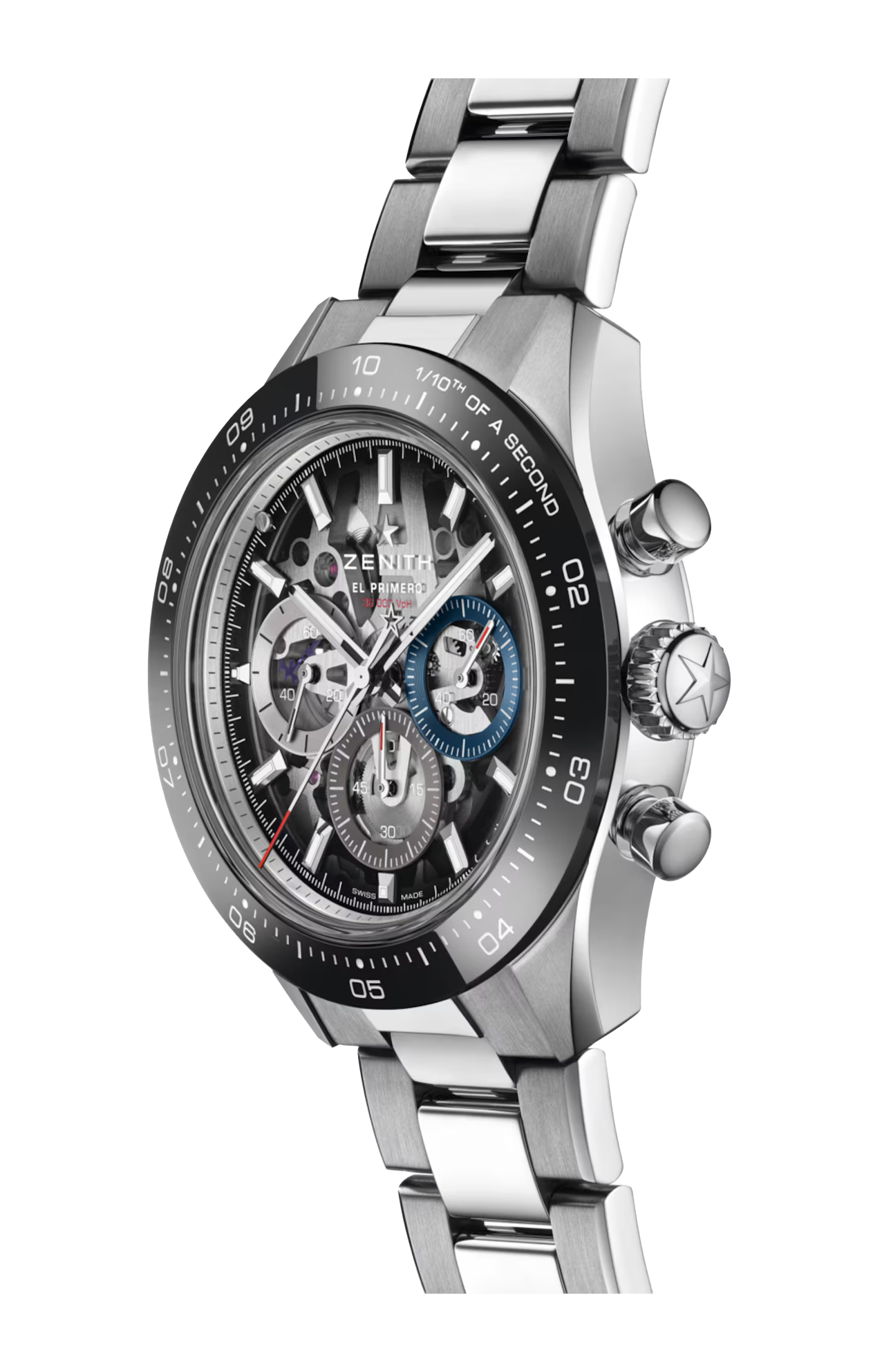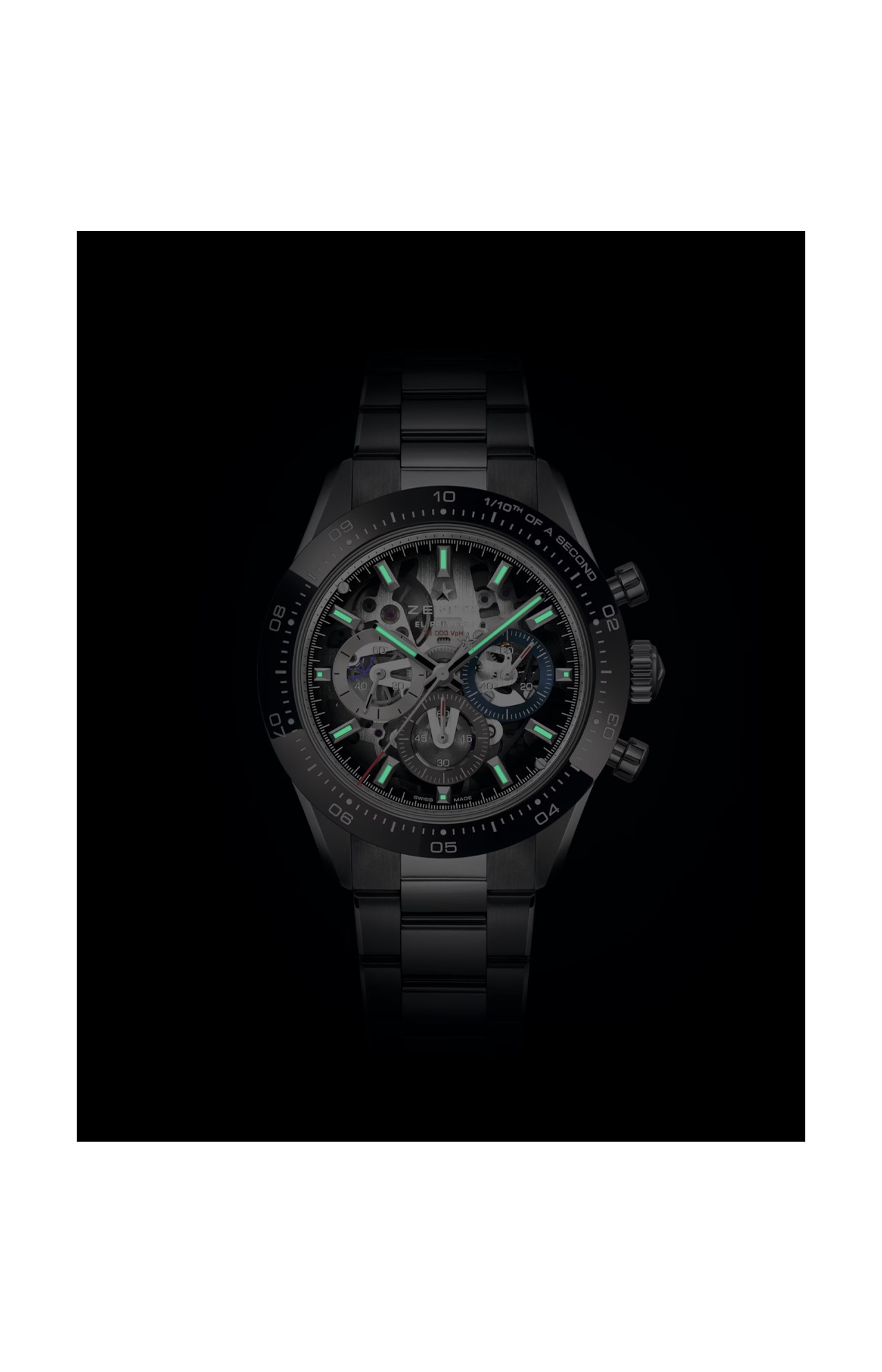 Il movimento cronografico automatico ad alta frequenza El Primero 3600 SK oscilla alla frequenza di 5 Hz (36.000 a/ora) per misurazioni con una precisione al 1/10 di secondo. La struttura scheletrata consente di ammirare i suoi meccanismi complessi, garantendo un’estetica elegante e una riserva di carica di 60 ore.