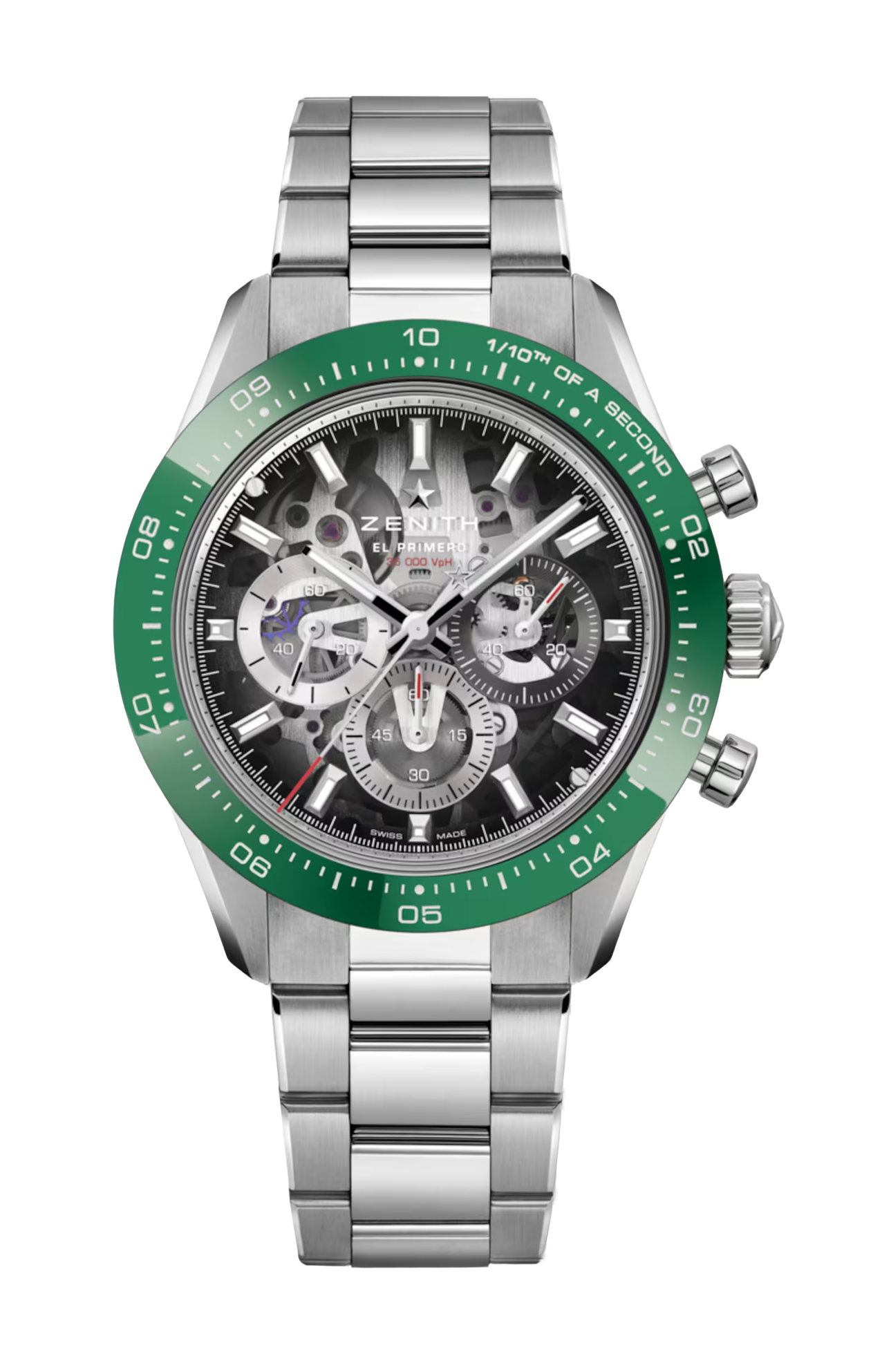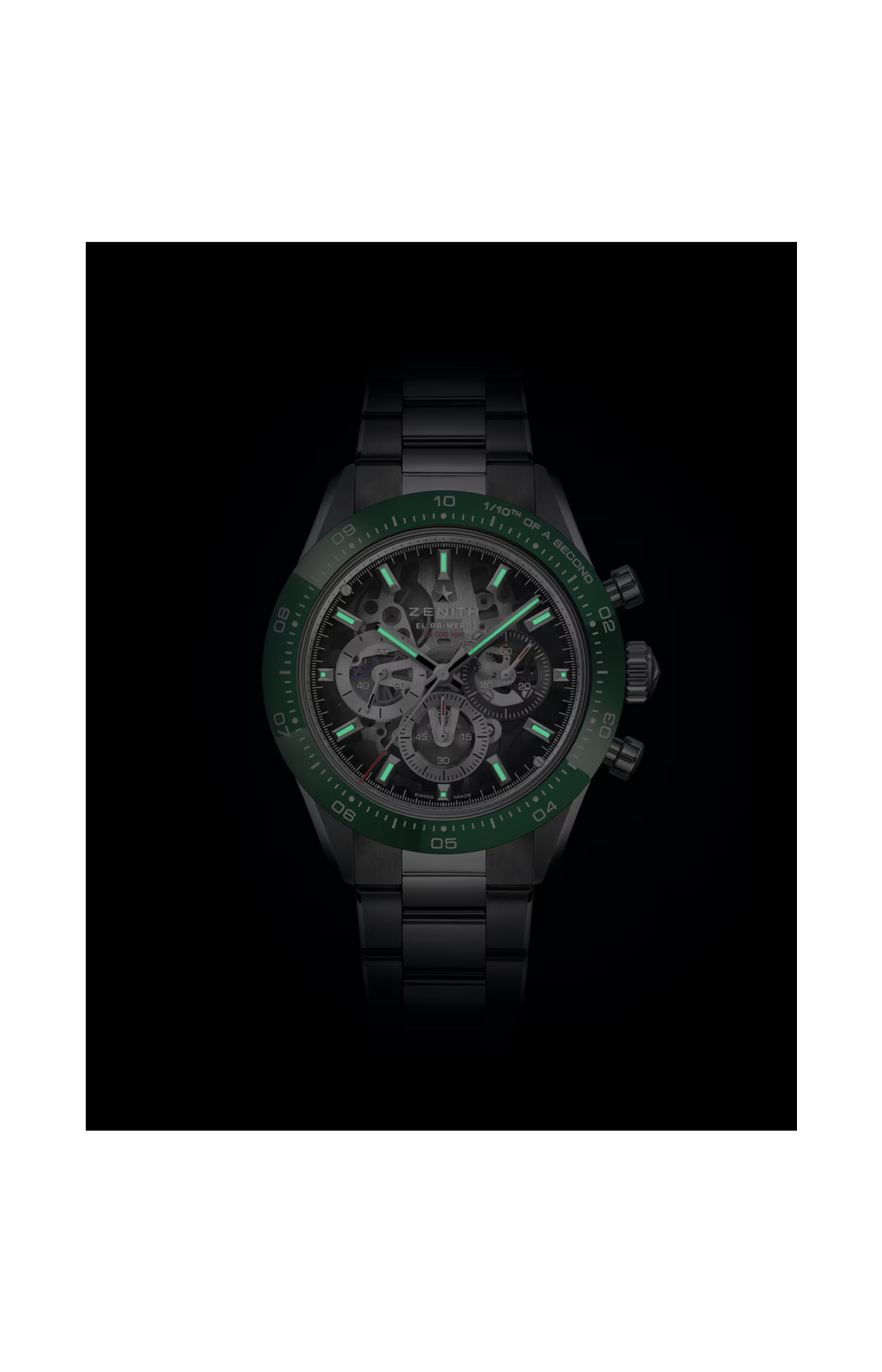 Il Chronomaster Sport Skeleton con la sua straordinaria lunetta in ceramica verde è l’emblema dell’eleganza sportiva. Animato dal movimento ad alta frequenza El Primero 3600 SK, offre una precisione di lettura senza pari al 1/10 di secondo. L’avanzata fibbia déployante micro-regolabile offre un comfort senza pari, un’autentica espressione dello spirito innovativo di ZENITH.