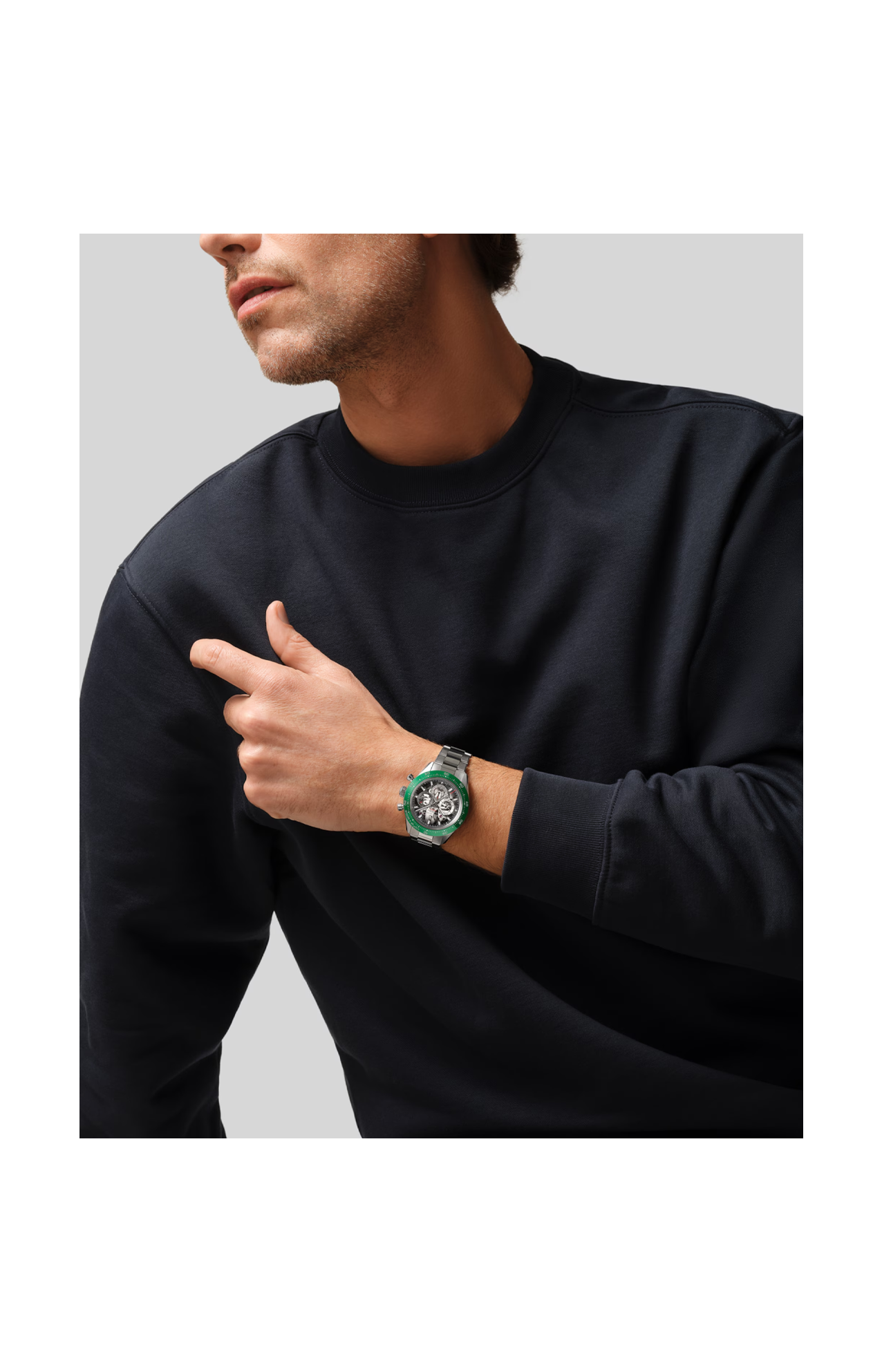Il CHRONOMASTER Sport Skeleton con cassa da 41 mm in acciaio inossidabile unisce i classici pulsanti a pompa a una moderna lunetta in ceramica verde. Il quadrante in vetro zaffiro fumé con contatori in tre tonalità di grigio rivela il calibro scheletrato El Primero 3600 SK, un movimento cronografico automatico ad alta frequenza con ruota a colonne e una funzione cronografica che misura i decimi di secondo. Fornito con un bracciale in acciaio con fibbia déployante regolabile ultra confortevole e un cinturino aggiuntivo in caucciù verde.