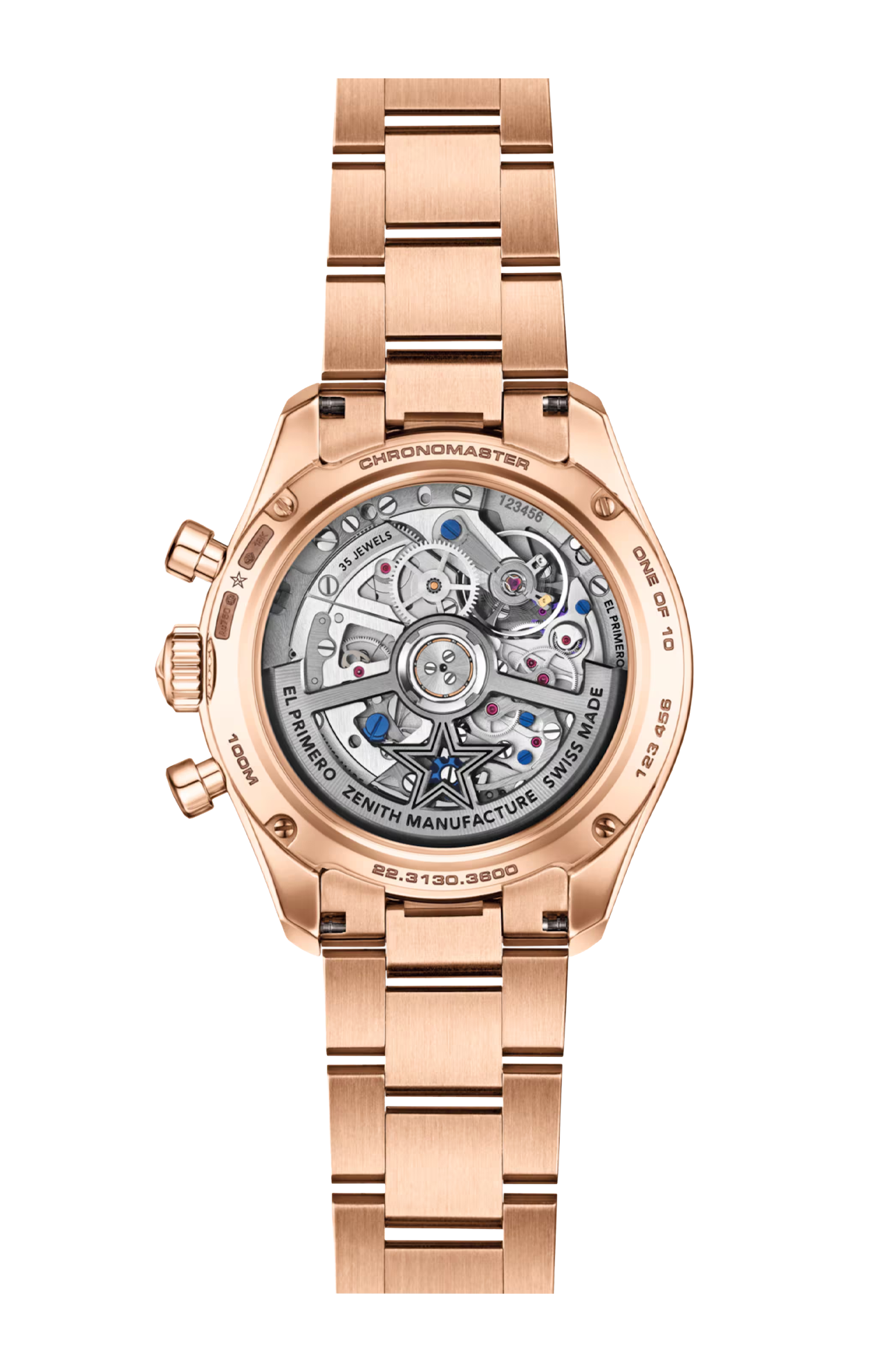 Il movimento cronografico automatico ad alta frequenza El Primero 3600 SK oscilla a 5 Hz (36,000 a/ora), e consente una misurazione precisa di 1/10 di secondo. La struttura scheletrata consente di ammirare i suoi meccanismi complessi, garantendo un’estetica elegante e una riserva di carica di 60 ore.