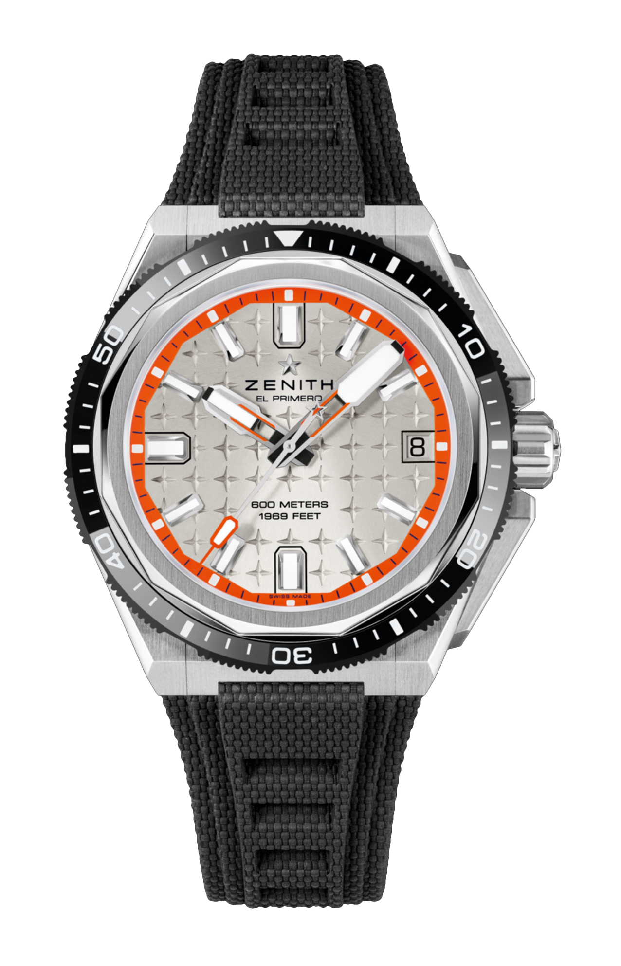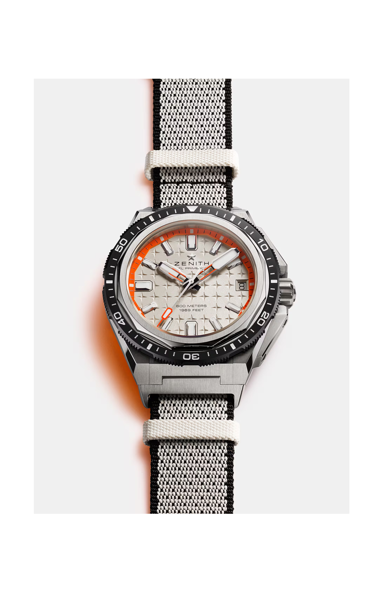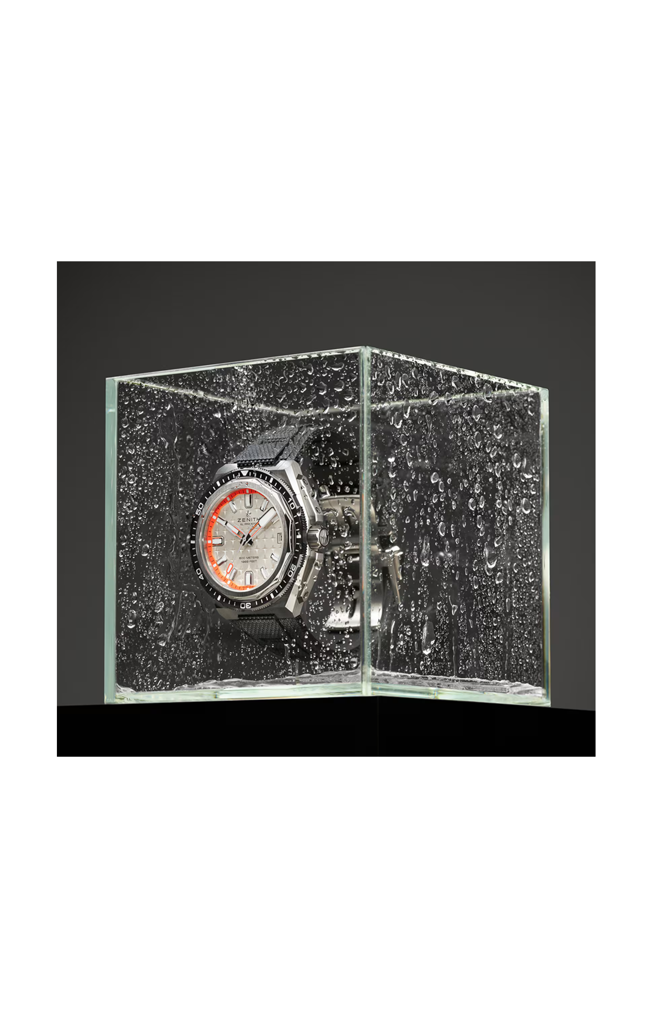 Il Defy Extreme Diver con cassa angolare da 42,5 mm in titanio è dotato di una lunetta girevole in ceramica nera e di una valvola per la fuoriuscita dell’elio con impermeabilità fino a 60 ATM (600 metri). Presenta un quadrante argento con motivo a stelle e indici e lancette luminose. Animato dal movimento automatico El Primero 3620 SC con riserva di carica di 60 ore. Sistema di cinturini intercambiabili con bracciale in titanio, cinturino in caucciù e cinturino in tessuto monopezzo realizzato con reti da pesca riciclate.
