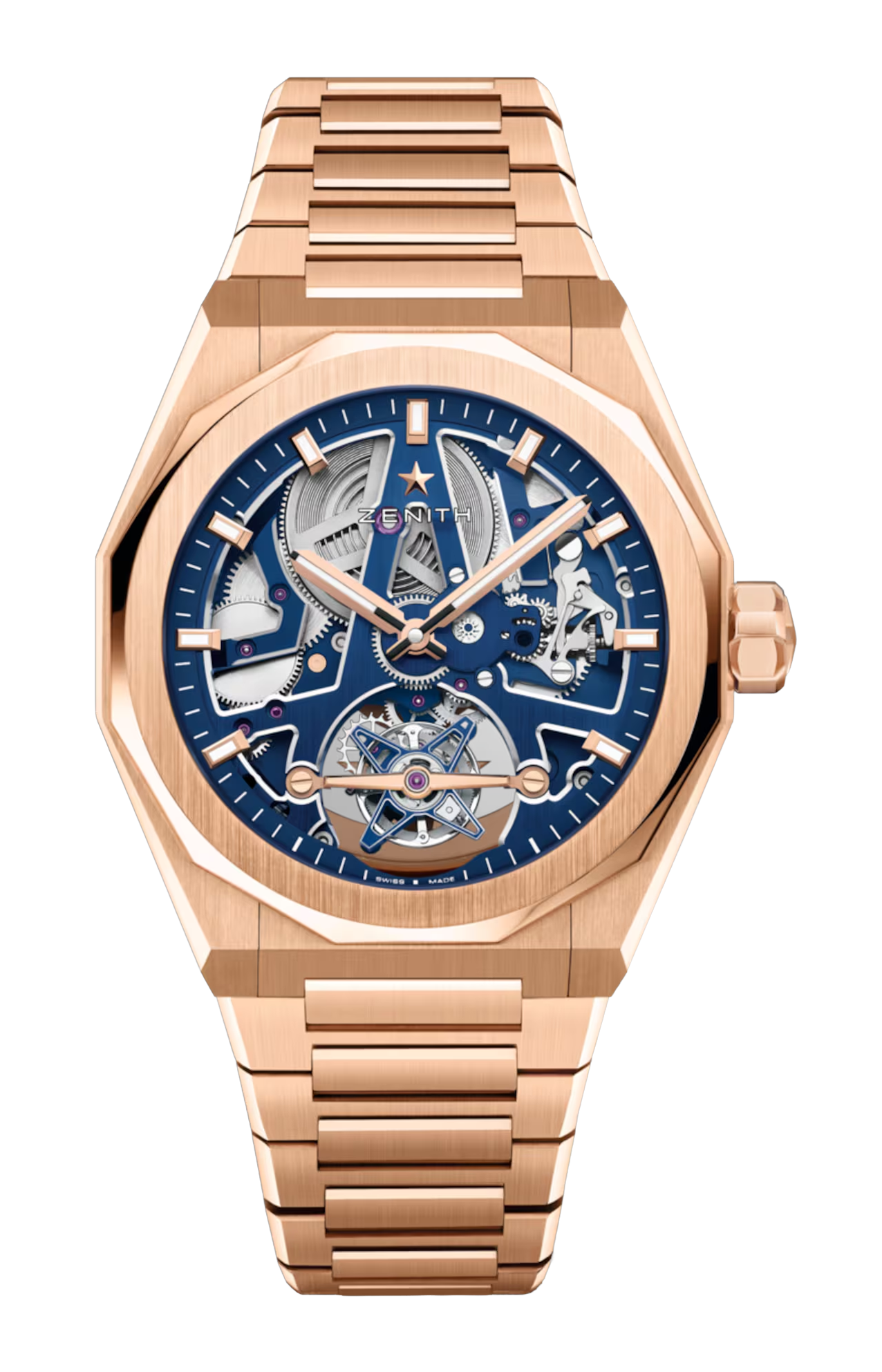 ZENITH presenta il primo DEFY Skyline Tourbillon Skeleton, un segnatempo caratterizzato da un’architettura audace, da una trasparenza innovativa e da un equilibrio meccanico. Il movimento El Primero scheletrato in blu intenso è sospeso in una radiosa cassa in oro rosa, la cui silhouette angolare cattura la luce ad ogni movimento del polso. Al contempo, la rotazione ad alta frequenza del tourbillon evoca una città pulsante di energia. Fedele al carattere di questa linea, il movimento scheletrato è costruito come uno skyline meccanico, dove la precisione trasparente incontra il design urbano. Il sistema di cinturini intercambiabili permette di alternare il bracciale in oro rosa al cinturino in caucciù blu per una perfetta versatilità.