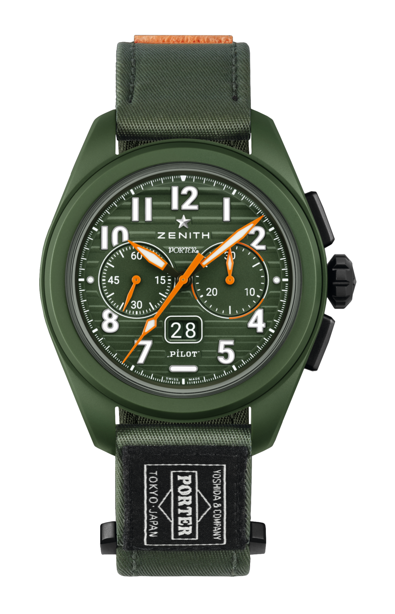Il Pilot Big Date Flyback Porter in edizione limitata vanta una cassa in ceramica verde kaki da 42,5 mm con corona sovradimensionata e un quadrante testurizzato verde kaki con numeri arabi luminescenti di grandi dimensioni. Animato dal calibro cronografico automatico ad alta frequenza El Primero 3652 con funzioni grande data e flyback. Per completare il look, il Pilot Big Date Flyback Porter Edition è dotato di due cinturini. Il primo, realizzato con un resistente tessuto di nylon fornito da Porter, è un cinturino in nylon color verde kaki con elementi in velcro arancioni, con il logo Porter cucito. Il secondo è un cinturino in caucciù effetto “Cordura” color verde kaki.