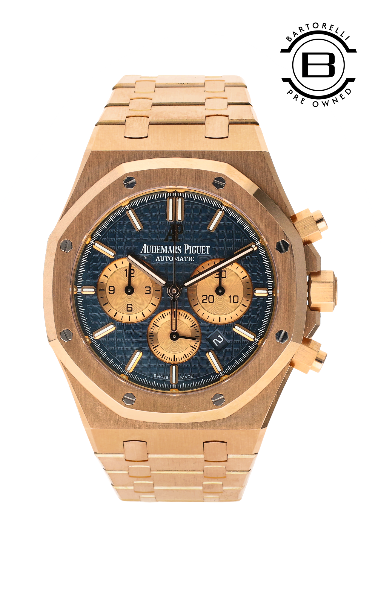 L’Audemars Piguet Royal Oak Chronograph è un cronografo di lusso che incarna alla perfezione l’equilibrio tra eleganza sofisticata e prestazioni meccaniche, un simbolo dell’orologeria sport-chic pensato per distinguersi in ogni occasione. La cassa da 41 mm in oro rosa presenta la celebre lunetta ottagonale con otto viti esagonali, un tratto iconico del design Royal Oak creato da Gérald Genta. Il quadrante, impreziosito dall’intramontabile motivo “Grande Tapisserie”, offre grande profondità visiva e ospita i tre contatori del cronografo — piccoli secondi, 30 minuti e 12 ore — disposti in modo armonioso, con la data tra le ore 4 e 5 per una leggibilità equilibrata. Il movimento automatico calibro 2385 assicura precisione e affidabilità, con una riserva di carica di circa 40 ore, mentre il bracciale integrato con finiture lucide e satinate garantisce comfort e riconoscibilità immediata. Elegante sotto il polsino ma al tempo stesso deciso al polso, questo cronografo si rivolge a chi cerca un segnatempo iconico e versatile, capace di unire tecnica raffinata, design leggendario e la tradizione manifatturiera di una delle Maison più prestigiose al mondo.