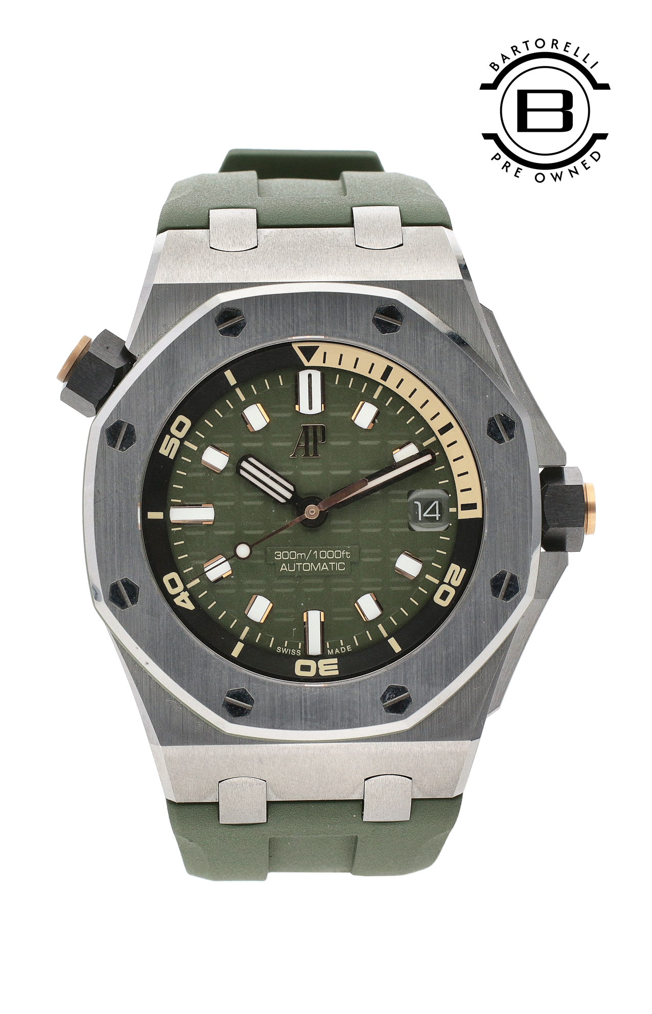L’Audemars Piguet Royal Oak Offshore 15720ST.OO.A052CA.01 è un cronografo sportivo di alta orologeria che incarna lo spirito audace e dinamico della celebre collezione Offshore, pensato per chi ama prestazioni tecniche, estetica sportiva e lusso senza compromessi. La cassa da 42 mm in acciaio inossidabile offre robustezza e presenza al polso, con finiture satinate e lucidate che esaltano il caratteristico design ottagonale della lunetta con otto viti esagonali a vista, simbolo riconoscibile del Royal Oak. Il quadrante “Mégа Tapisserie” grigio-antracite è caratterizzato da contatori cronografici ben leggibili, indici applicati luminescenti e lancette tonde con rivestimento luminescente per una visibilità ottimale in ogni condizione di luce, mentre la finestrella della data è integrata con discrezione tra i contatori. Il movimento cronografo automatico di manifattura, con funzione cronografica a 12 ore, garantisce precisione e affidabilità, abbinando performance tecniche a un’esperienza d’uso quotidiana di alto livello. Protetto da vetro zaffiro antigraffio con trattamento antiriflesso e garantendo impermeabilità fino a 300 metri, questo segnatempo è progettato per resistere alle sollecitazioni della vita attiva senza rinunciare allo stile. Il cinturino in caucciù verde cachi intercambiabile, con fibbia ad ardiglione in acciaio, e il cinturino supplementare in caucciù nero uniscono comfort e sportività, rendendo l’orologio perfetto sia per l’uso quotidiano sia per occasioni più dinamiche. Il Royal Oak Offshore 15720ST.OO.A052CA.01 è una scelta ideale per chi cerca un cronografo che unisca lusso, sportività e prestazioni tecniche in un design iconico e riconoscibile.