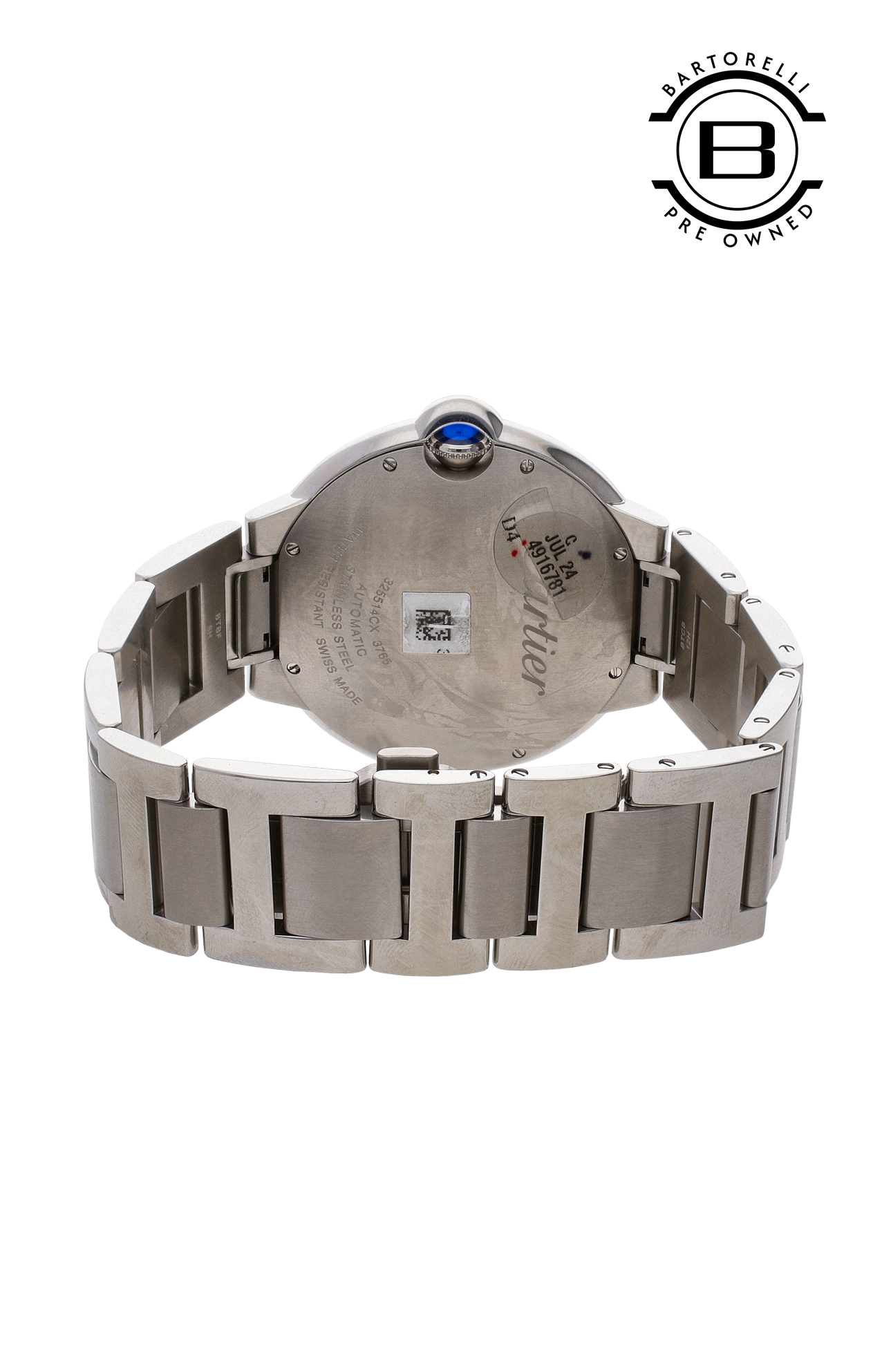Orologio Ballon Bleu de Cartier, 42 mm. Movimento meccanico a carica automatica, calibro 1847 MC. Cassa in acciaio, corona scanalata ornata di uno spinello sintetico cabochon. Quadrante argentato guilloché. Lancette a forma di gladio d’acciaio azzurrato. Vetro zaffiro. Datario a finestrella a ore 3. Bracciale intercambiabile in acciaio. Spessore 13 mm. Impermeabile fino a 30 metri.
