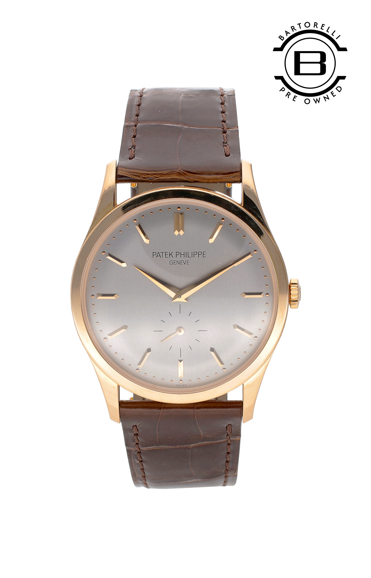 Orologio da uomo Patek Philippe Calatrava 5196R-001. Cassa da 37 mm in oro rosa 18 carati con lunetta liscia in oro rosa 18 carati. Quadrante argento con lancette e indici delle ore in oro rosa. Quadrante secondario dei piccoli secondi tra le ore 5 e 7. Cinturino in pelle nera con fibbia in oro rosa 18 carati. Adatto a polsi fino a 7,5 pollici. Vetro zaffiro. Fondello in oro rosa 18 carati. Movimento meccanico a carica manuale calibro 215 PS con riserva di carica fino a 48 ore.