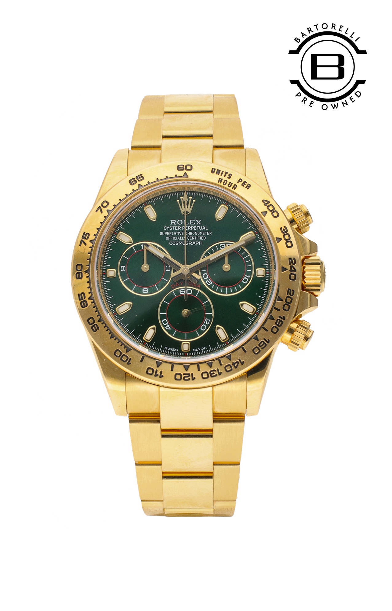 Il Rolex Daytona 116508, affettuosamente noto come il Daytona "John Mayer", è diventato uno dei modelli Daytona moderni più ricercati. Realizzata in oro giallo 18 carati, la cassa da 40 mm incarna un lusso senza tempo, completata da un bracciale Oyster in oro giallo abbinato con maglia centrale lucida e chiusura Oysterlock per una finitura impeccabile ed elegante. Lo straordinario quadrante verde metallizzato con finitura soleil, abbinato ai quadranti secondari dorati a contrasto, conferisce all'orologio un carattere unico e un fascino da collezione. Le lancette e gli indici delle ore con trattamento Chromalight garantiscono un'eccellente leggibilità, mentre i contatori dei 30 minuti e delle 12 ore del cronografo e il quadrante secondario dei piccoli secondi garantiscono una funzionalità precisa. Resa popolare dal musicista John Mayer, questa referenza ha guadagnato lo status di oggetto di culto tra i collezionisti, combinando la tradizione automobilistica di Rolex con un design vivace e audace che la distingue nella gamma Daytona.